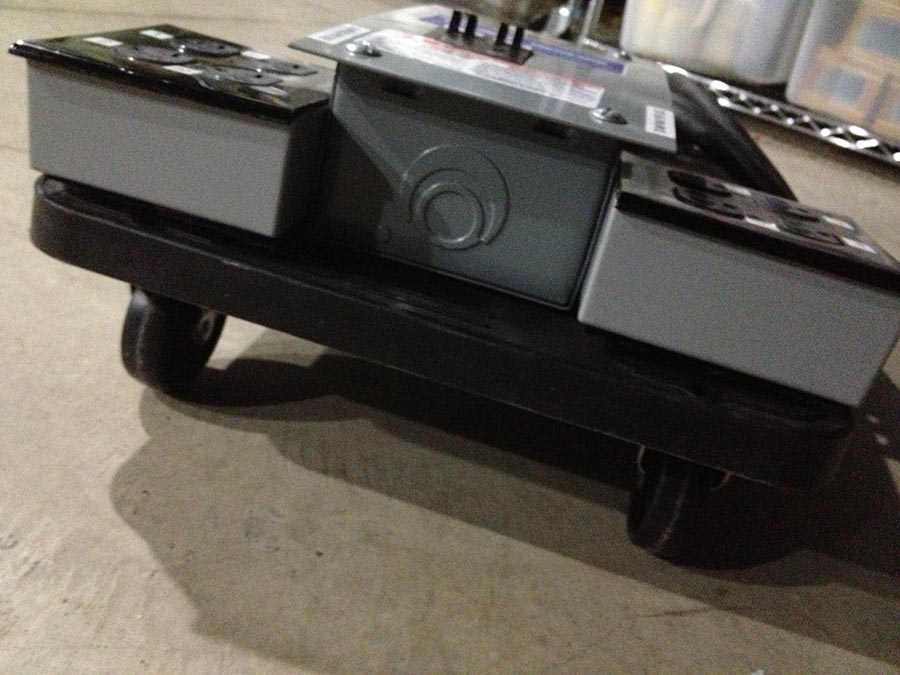 With the grid complete, all I was missing was the required power and proper power distribution system. This is the part of the build that can get dangerous very quickly. And since I value my life, and it is worth more to me than the savings of a couple of bucks, I opted to hire an electrician friend of mine to help me with that part of the build. And I STRONGLY recommend that you do the same. When I met with him, I explained what I wanted to do: have a mobile breaker box that supplied 60 amps of power routed into two legs. And I wanted the other end to be a traditional dryer plug. The reason I went with these specs is that most dryer outlets have a breaker of 60 amps, and I wanted to be able to use this box with me in my studio, as well as take the box with me on location. By having it be a standard dryer plug, I can tap into someone's dryer outlet and instantly have 4 more circuits, and 60 more amps to work from. (See- thinking & planning ahead can pay off ... ;) )